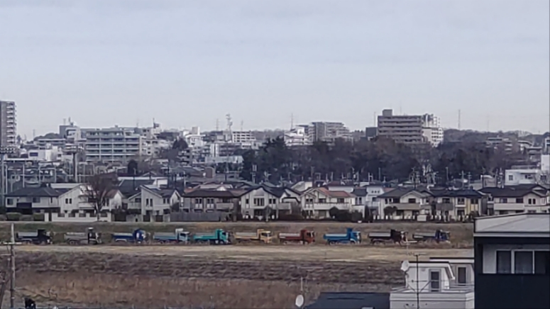 多摩川布田ダム調布側上流の工事のために、朝7時30分位に上流に向かってトラックが土砂を運んていきます。
