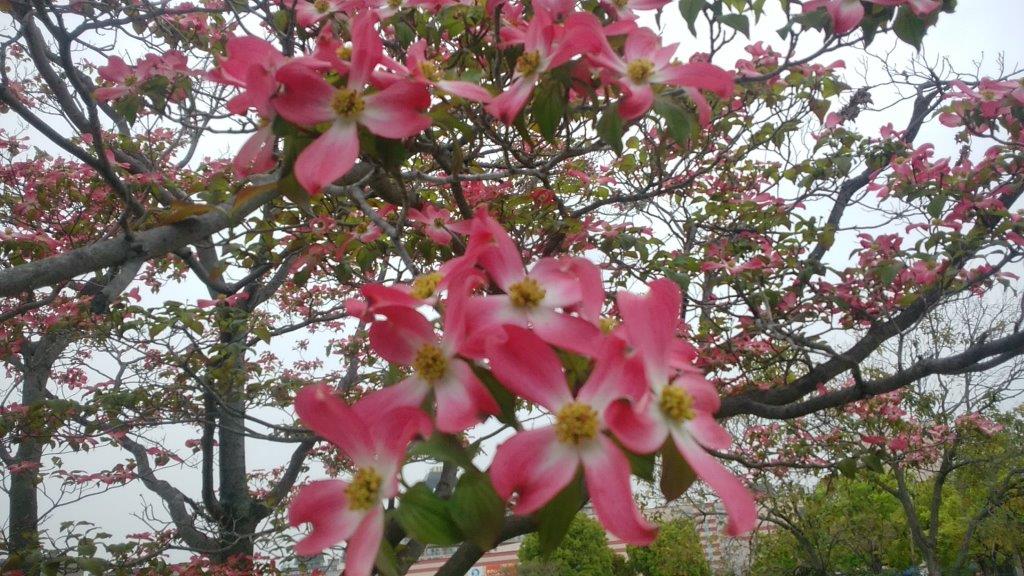 黄砂が漂う曇り空、どんよりとした空模様です、ソメイヨシノが葉サクラとなり、入れ替わりにハナミズキの花が見頃と成っています。虫害が少なく、生育が緩やかで樹形の管理が簡単なので、